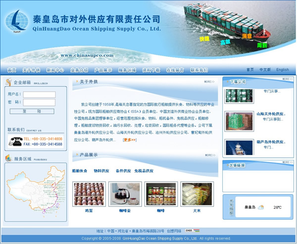 我公司創(chuàng)建于1958年,是海關總署指定的為國際航行船舶提供伙食、物料等供應的專業(yè)性公司,現為國際船舶供應商協會(ISSA)會員單位、中國友誼外供商業(yè)協會會員單位、中國免稅品集團理事單位,經營范圍包括伙食、物料、船機備件、免稅品供應,船舶修理,船舶廢舊物資回收,油污水回收、處理,垃圾回收,國際船務代理等業(yè)務。公司下屬秦皇島港外輪供應分公司、山海關外輪供應分公司、滄州外輪供應分公司、曹妃甸外輪供應分公司、葫蘆島外輪供應分公司、船舶服務分公司、船舶工程分公司、中免(秦皇島)公司、金士威國際船務代理等分公司或子公司,總資產4000多萬元。