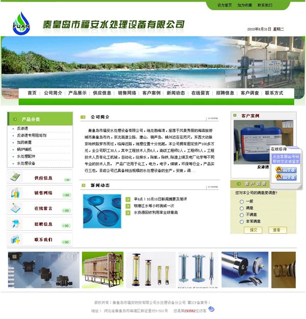 秦皇島市福安水處理設(shè)備有限公司,地處渤海灣,座落于風(fēng)景秀麗的海濱旅游城市秦皇島市內(nèi),京沈高速公路、唐山、葫蘆島、錦州近在在咫尺。東西大動脈京哈鐵路穿市而過,臨海近路,地理位置十分優(yōu)越。本公司擁有固定資產(chǎn)100多萬元,全公司職工30人,其中工程技術(shù)人員6人,高級工程師2人,工程師5人,工程技術(shù)人員有化工機(jī)械,自動化,給排水,除氧,除鐵,除渣上煤及電廠化學(xué)等不同專業(yè)的技術(shù)人員。 產(chǎn)品廣泛用于化工,電力,電子,煤碳,環(huán)保等行業(yè),產(chǎn)品實(shí)行三包。目前公司己具備相當(dāng)規(guī)模的水處理設(shè)備的生產(chǎn),安裝,調(diào)試,人員培訓(xùn)等能力。可為用戶提供可行性研究,技術(shù)咨詢,工程設(shè)計,設(shè)備制造,維修保養(yǎng),安裝調(diào)試,配件供應(yīng)等服務(wù)。并為用戶設(shè)計選型,安裝,調(diào)試,代培技術(shù)人員等提供更優(yōu)質(zhì)的服務(wù)。