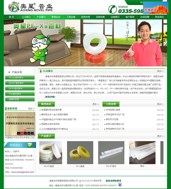 秦皇島市奧星新型管業(yè)有限公司,成立于2002年6月,座落于美麗的海濱城市秦皇島,專業(yè)從事地板采暖專用管材生產(chǎn)、銷售及地板采暖設(shè)計,施工的企業(yè)。是中國地面供暖委員會常務(wù)委員單位,“奧星管業(yè)”被認(rèn)定為秦皇島市知名商標(biāo)企業(yè),被推選為中國著名品牌,全國質(zhì)量、服務(wù)、信譽AAA品牌企業(yè)。我公司生產(chǎn)的PE—X、PE—RT、PP—R管材管件系列產(chǎn)品被列入中國工程建設(shè)重點推廣應(yīng)用產(chǎn)品。