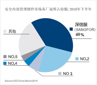 深信服科技在IDC中國發(fā)布的2010年下半年中國安全內(nèi)容管理市場(上網(wǎng)行為管理市場)報(bào)告中占有率達(dá)到40%,在2009年占有率達(dá)到33.8%,蟬聯(lián)市場占有率領(lǐng)先。